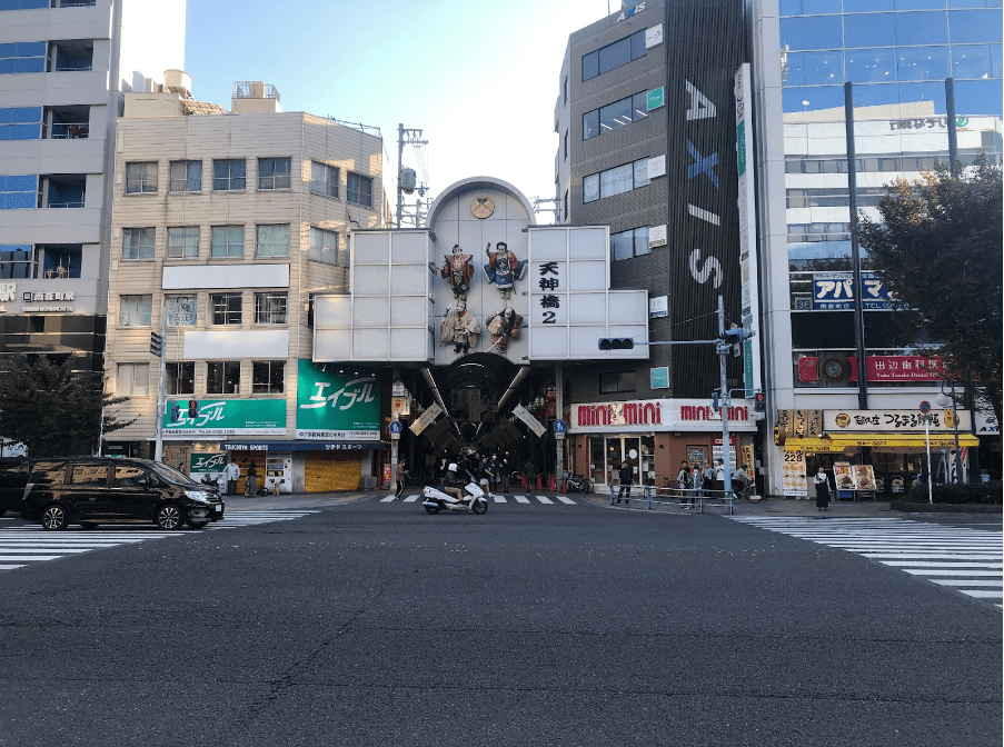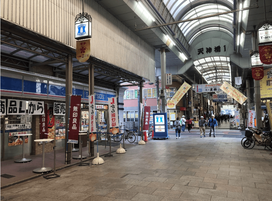 ↑駅やバス停を下車したあとは、天神橋筋商店街を南に進みます。写真に写っている商店街の入口を直進してください。